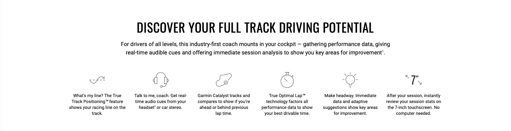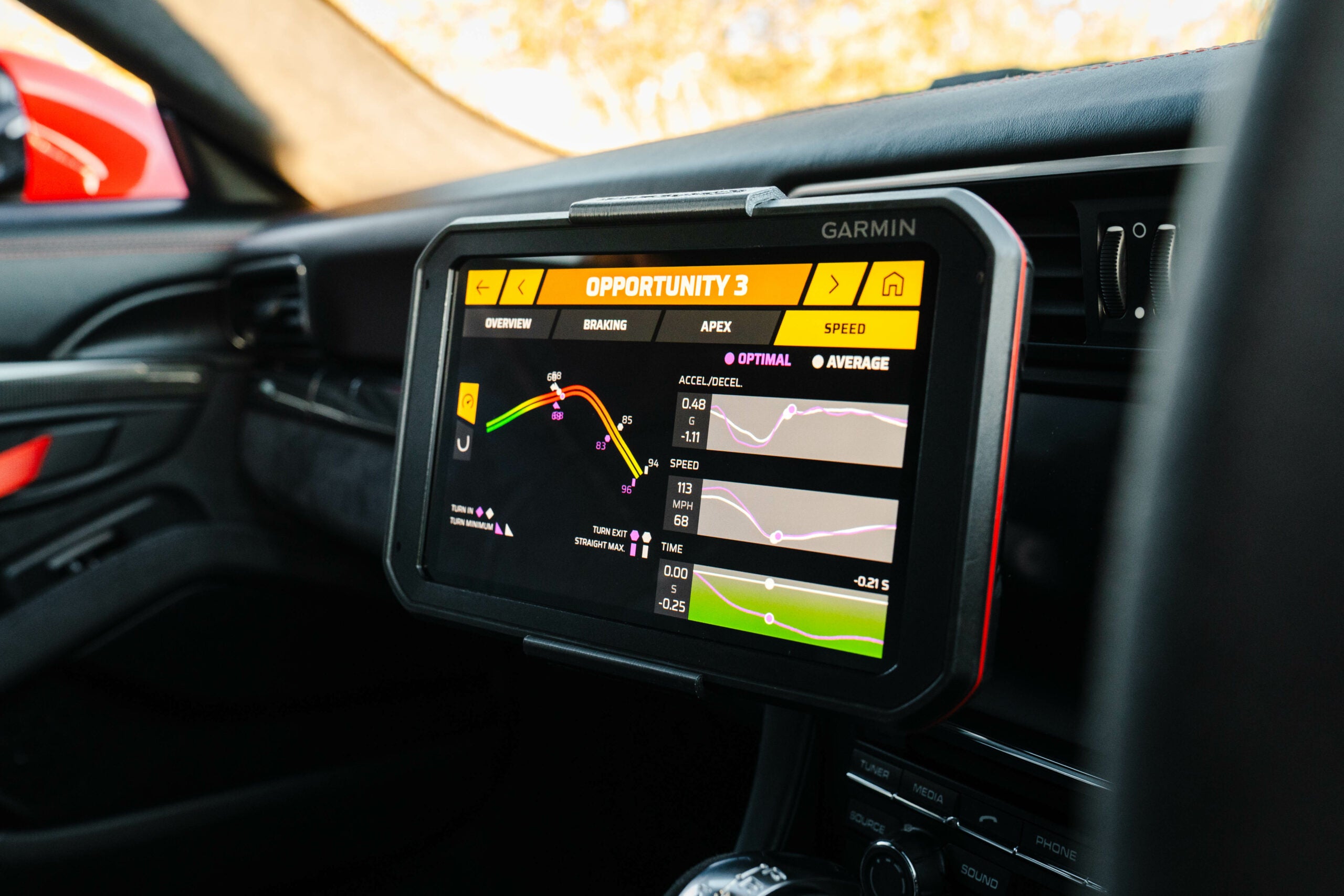 This innovative feature exclusive to Garmin Catalyst introduces a unique solution for high-performance driving. The feature uses advanced algorithms to create a composite of your optimum achievable time, based on lines you actually drove and can repeat.