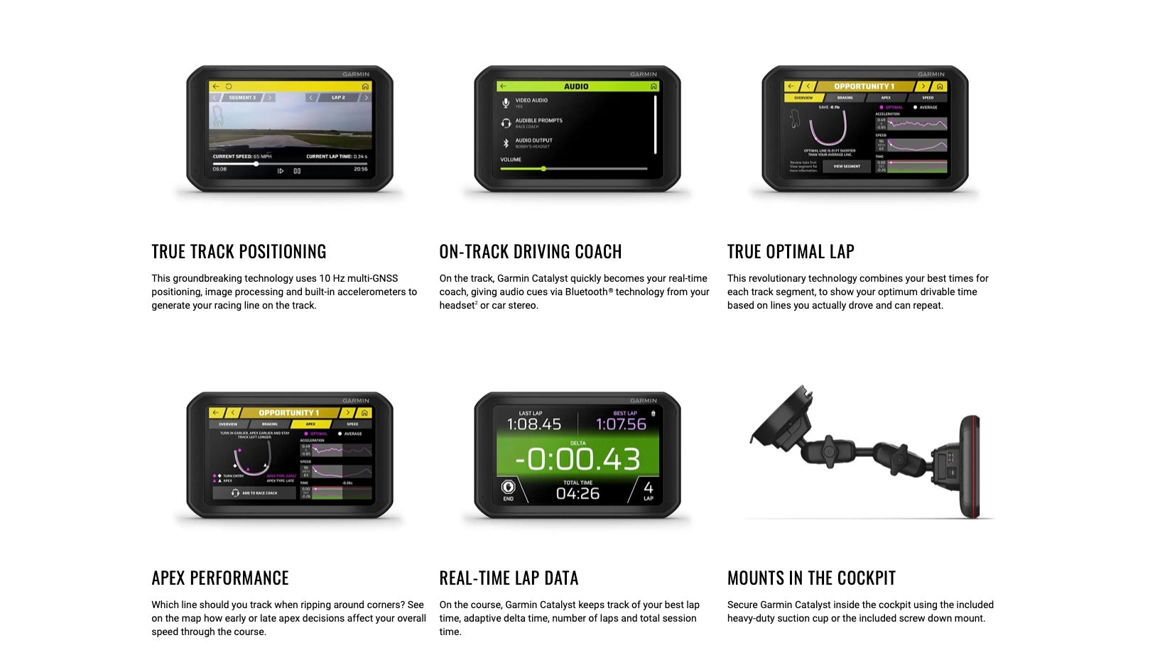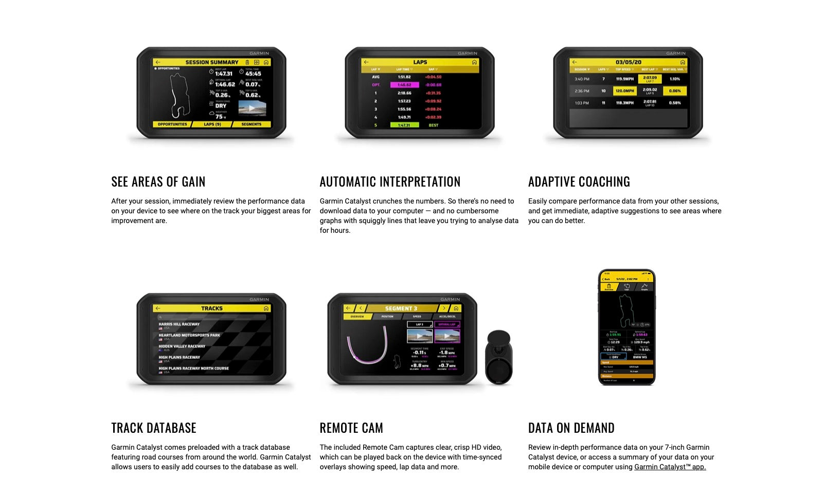 A preloaded track database includes road courses around the world. Plus, you can easily add tracks as well. Visit theonline support center, “Which Race Tracks are Available on the Garmin Catalyst?” for more information.